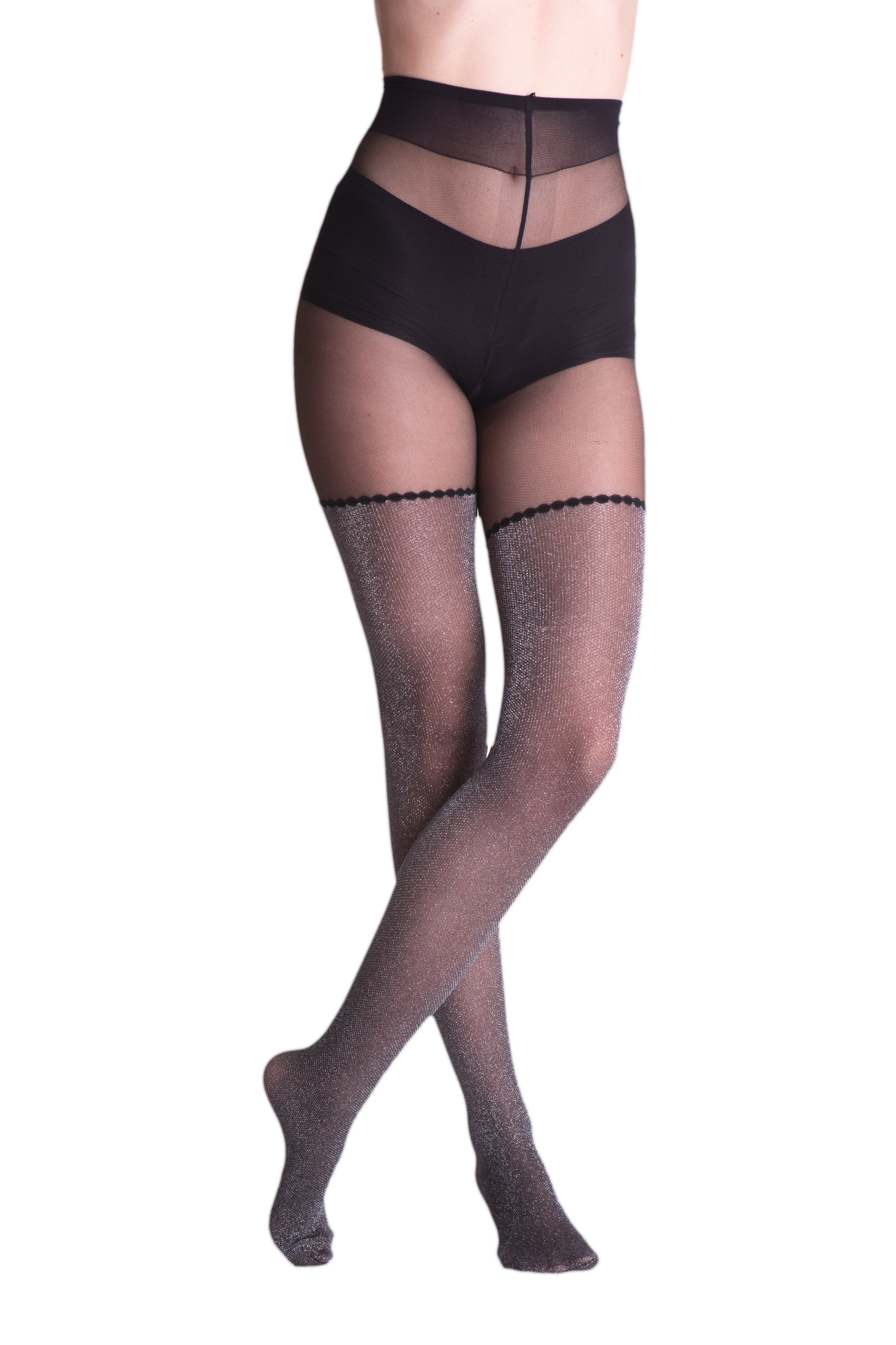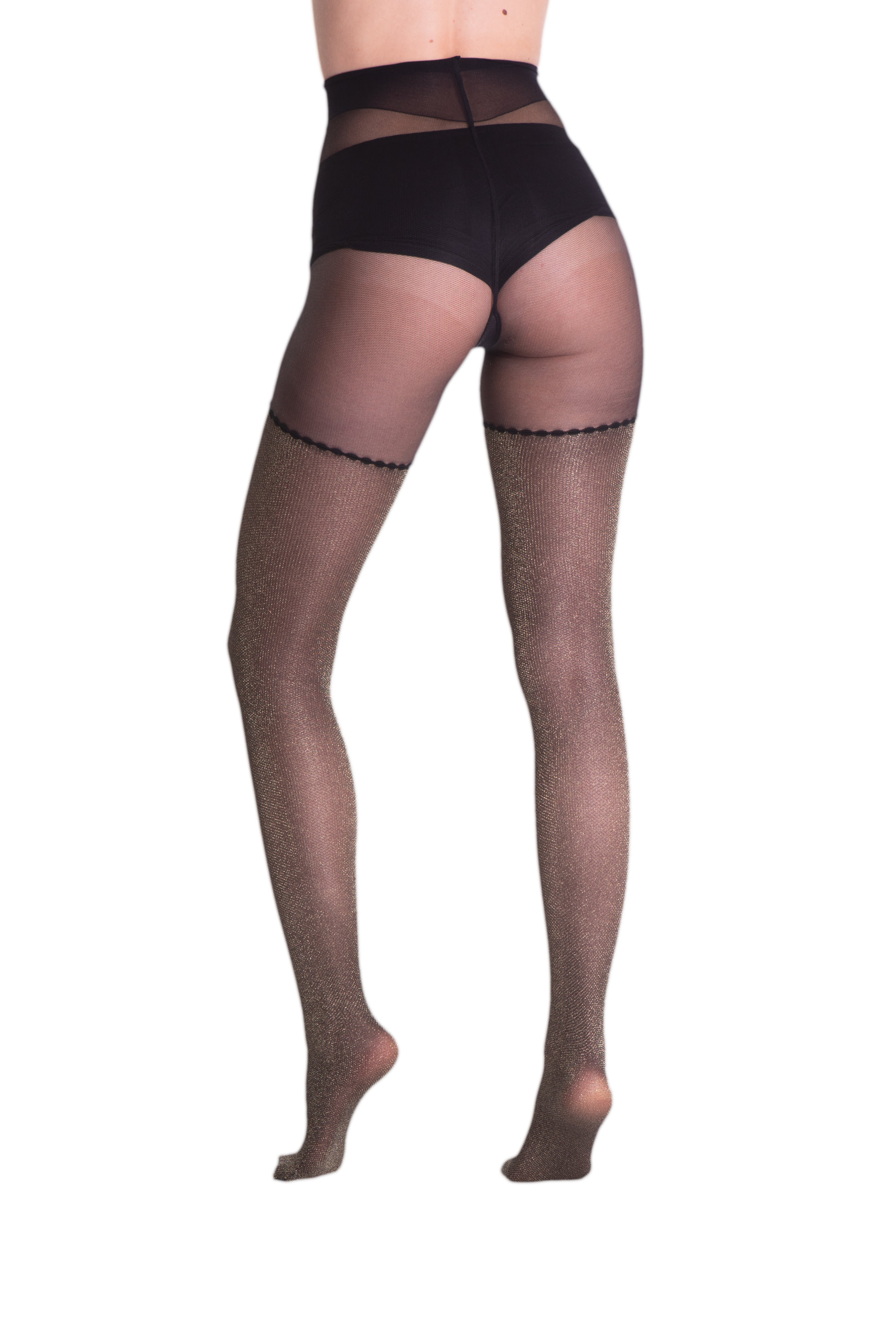 Collant 40 deniers motif bas jarretière en lurex. Un article élégant et sensuel qui fait briller les jambes sans exagérer. Convient parfaitement aux soirées les plus chics ou aux occasions où l'on veut briller.